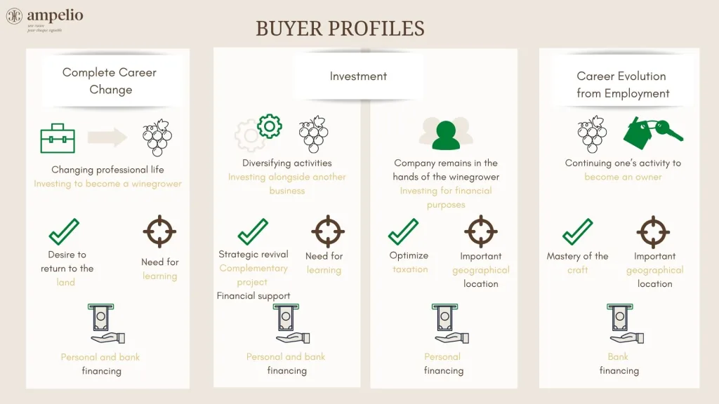 When financing is approved, these buyers will most often choose a vineyard within their own region, since they are most comfortable with the local viticultural methods. If bank financing is denied, another model can be applied: a financial investor may step in as a supportive partner, providing crucial backing for these technicians in search of independence.